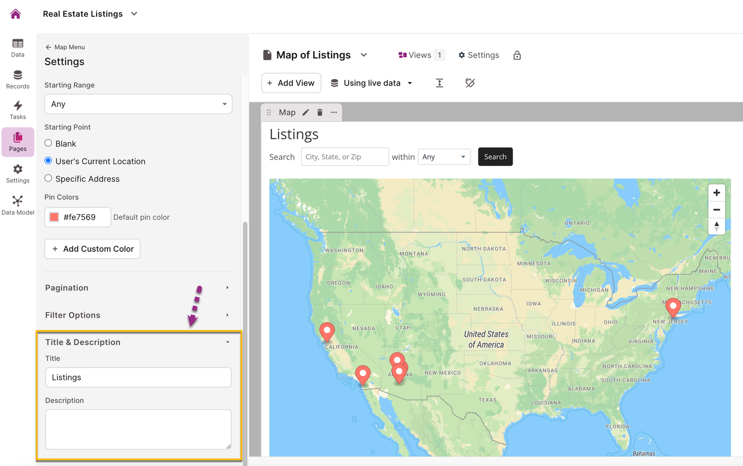 In the Map Settings section of the view editor, you can customize the title and description of your map or leave them blank.
