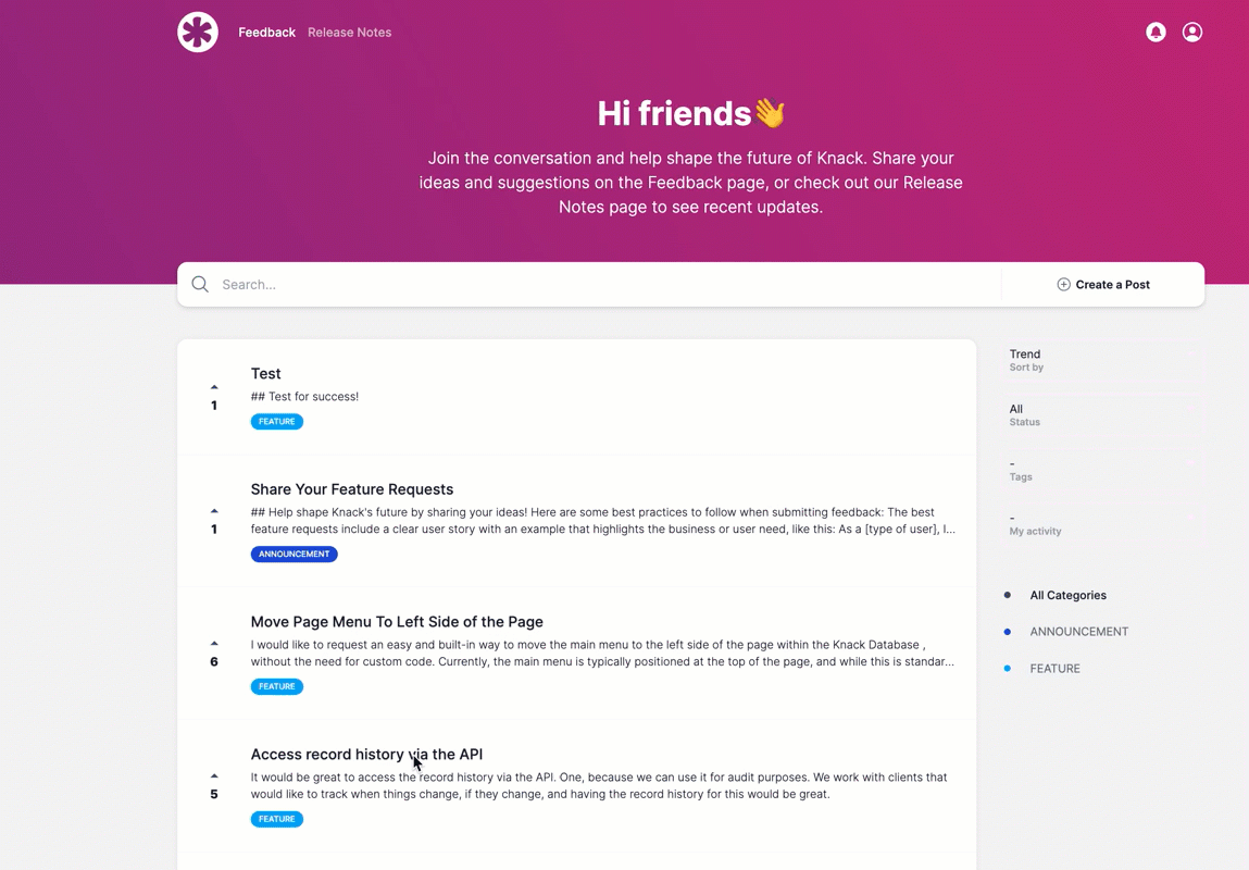 We're excited to share that we have launched a new way for our users to submit feature requests, vote on existing requests, and communicate with other Knacksters about requests! But, wait, there's more- we also have a new way of sharing release notes, including new feature updates, bug fixes, and product improvements and enhancements!