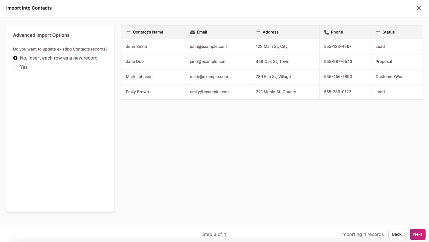 Once mapped, select "Next". In the Advanced Import Options, you can select if you would like to update existing records in the table:
