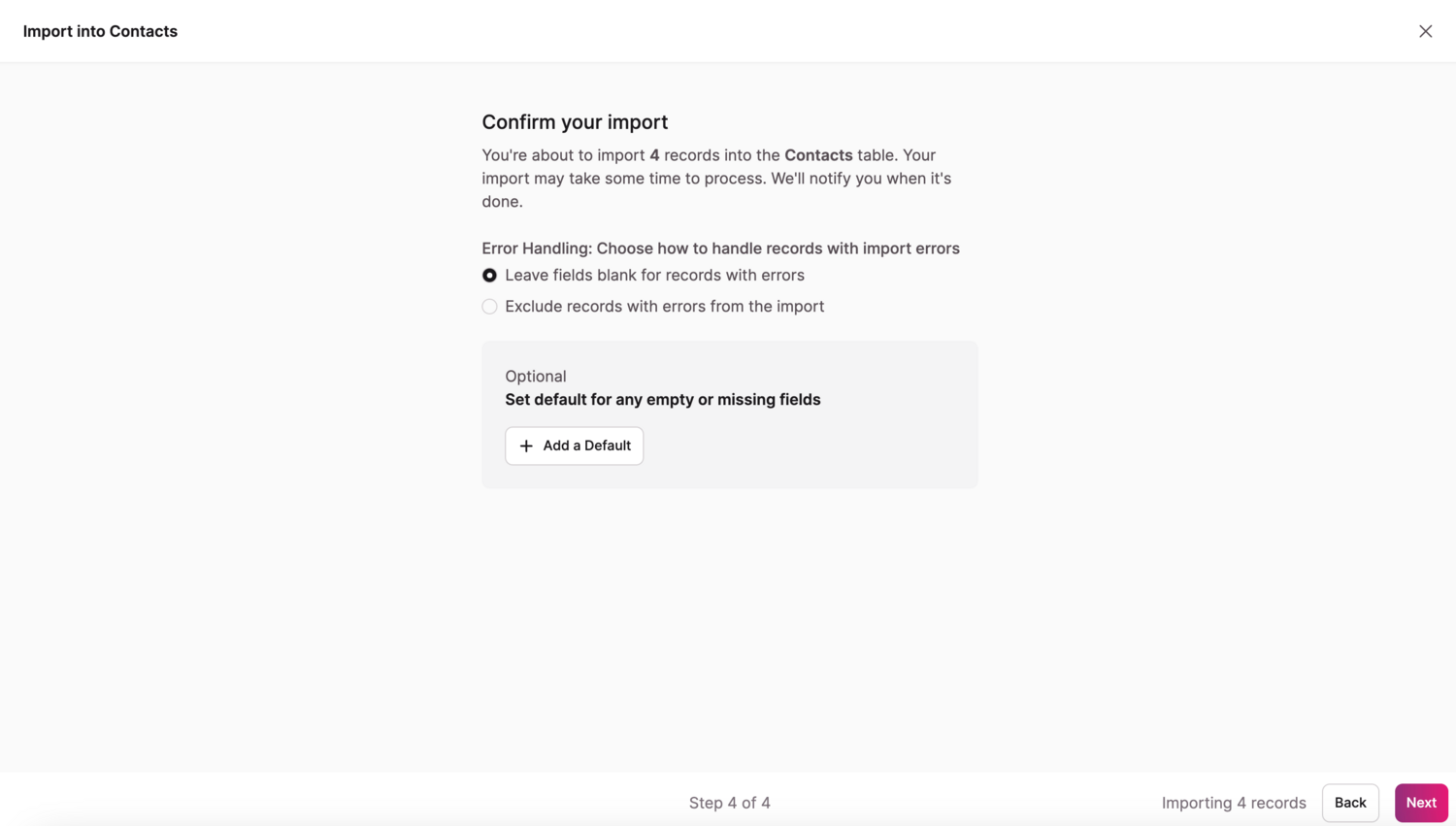 You can also set defaults for any empty or missing fields in your import in the Confirm Your Import step: