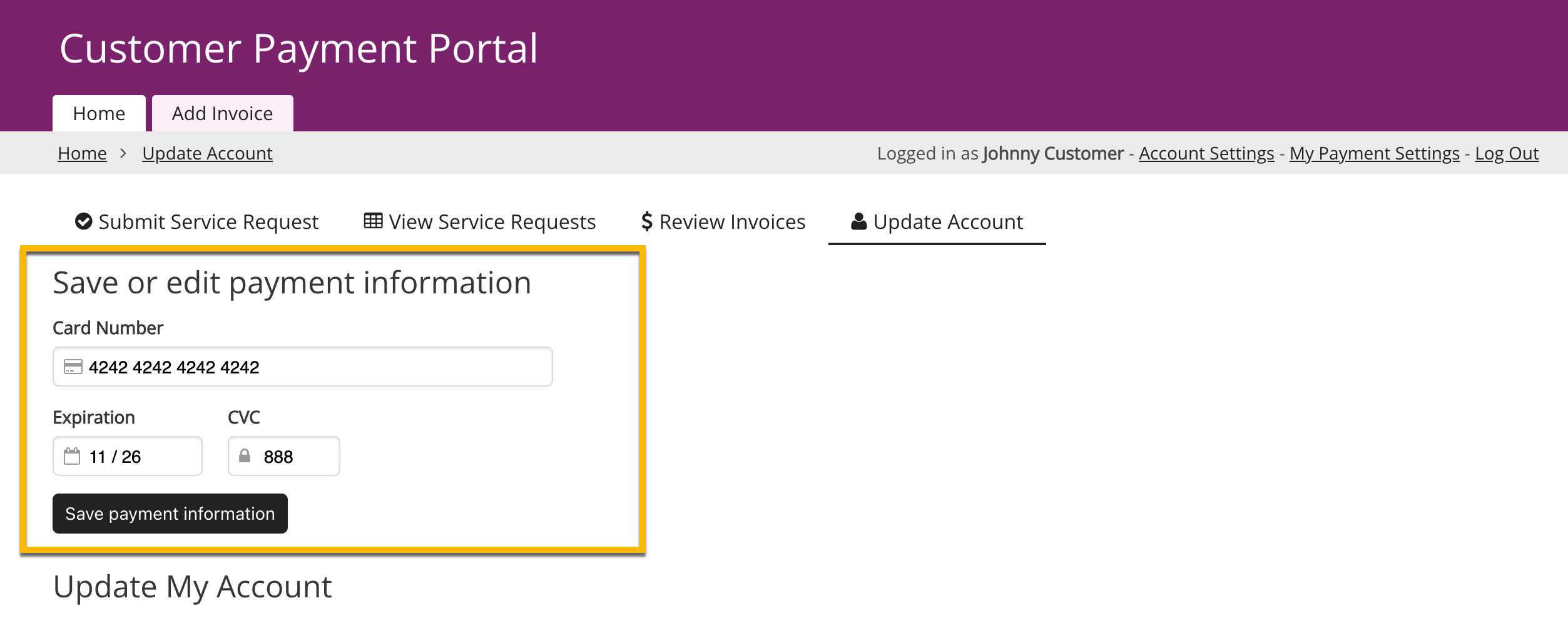 In this scenario, we aim to provide the convenience for a logged-in customer to easily update their payment information.