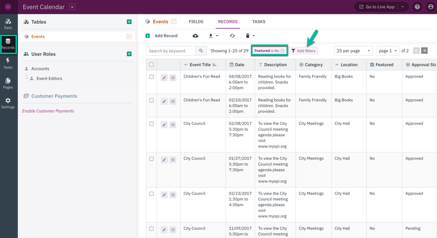 You can find these quick search options by accessing your table records in the Records section of the Builder. For example, in this Event Calendar app, you can quickly search for Event records that are not Featured.