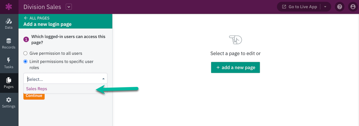 Select the Sales Rep user role, then choose the Records tab at the top. Select the Division cell to select a division for each record: