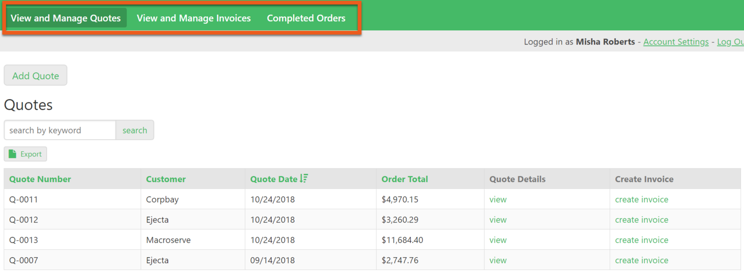 The Quotes table includes a multiple choice field that allows you to select the status of a quote, invoice, or paid.