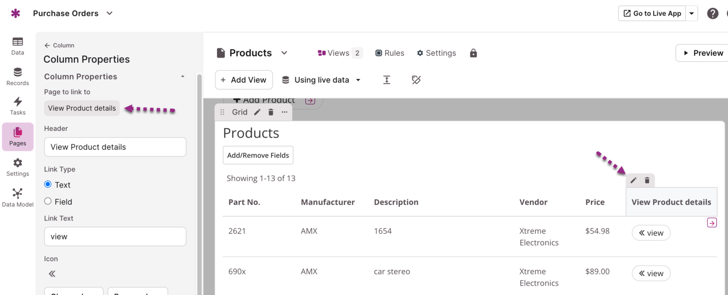 When adding fields from connected records, you can display these field values as a link. The value links allow you to link to another page in your app which can display these connected records. This option is only available under connected field columns.