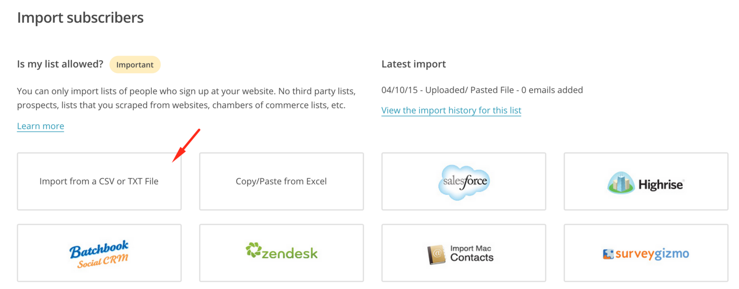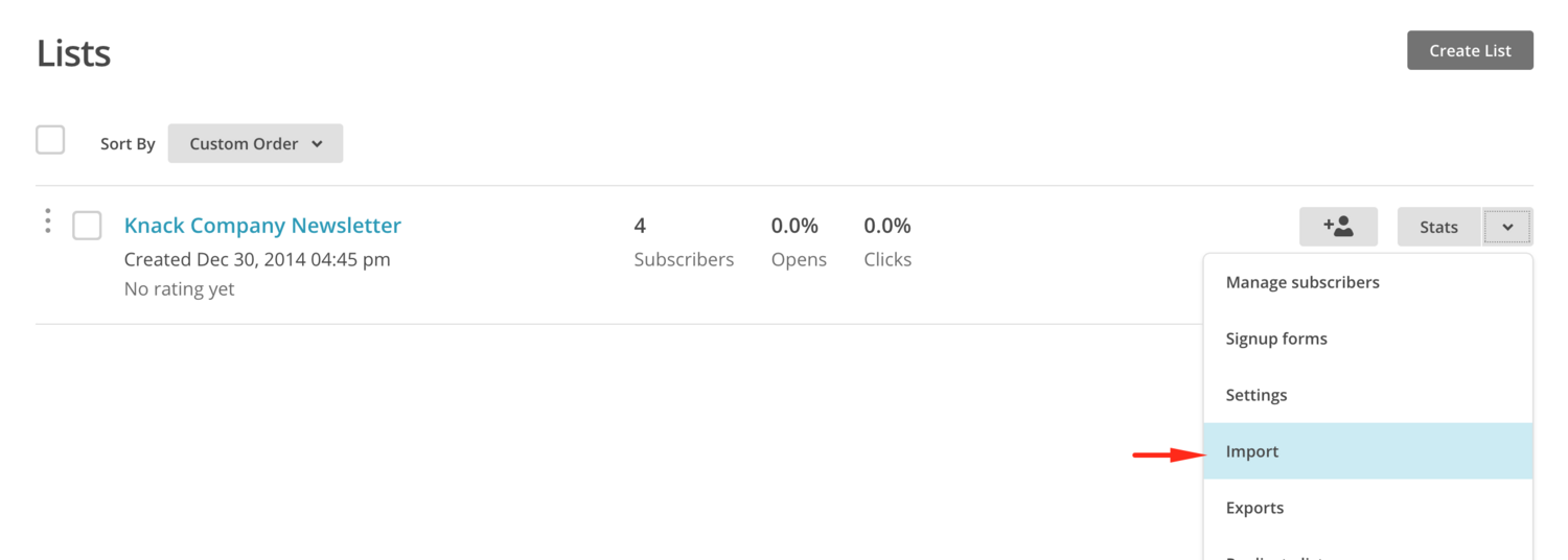 Select your Mailchimp mailing list by clicking on the settings dropdown on the right and selecting the Import setting.