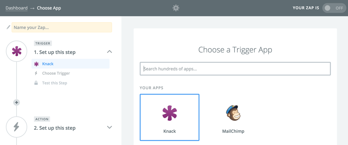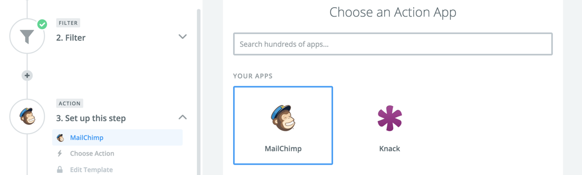 Now, you'll start setting up your Action by selecting the Mailchimp app.