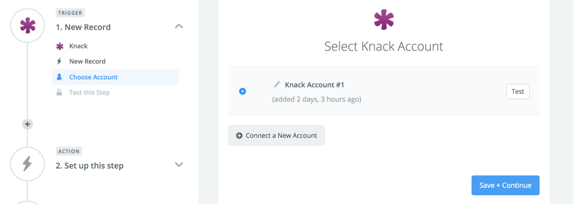 Select your Knack account. If you haven't already added your Knack account, you'll be given the option to do so by logging in with your Knack credentials. Select the Test button to confirm the account is working properly.