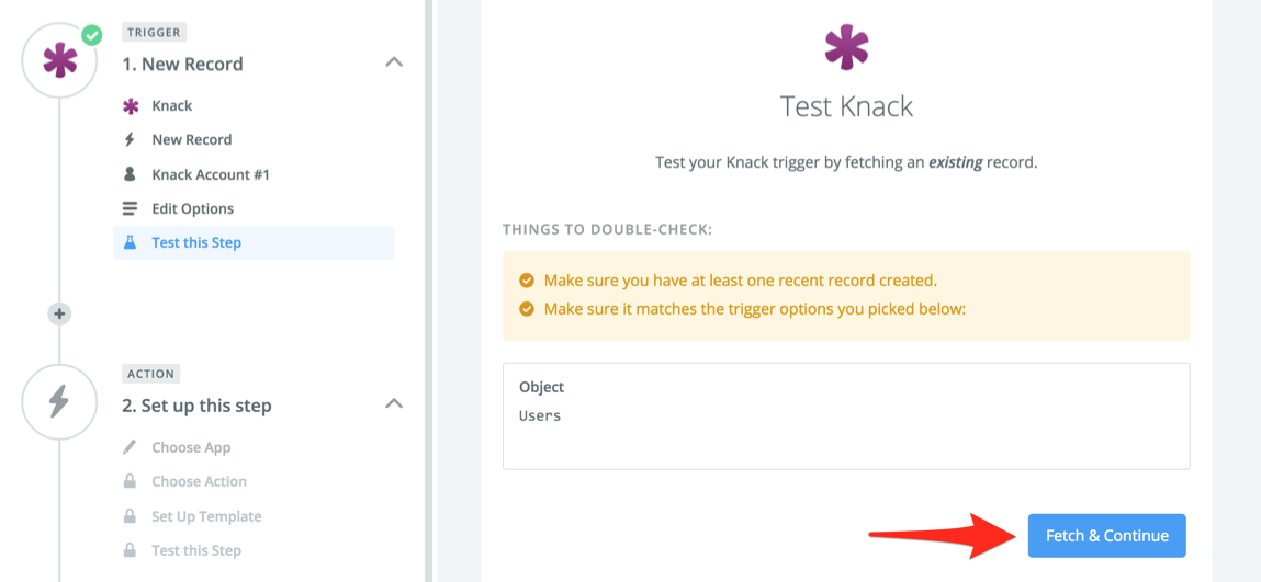 Select the Fetch & Continue button to confirm that the trigger is working properly.
