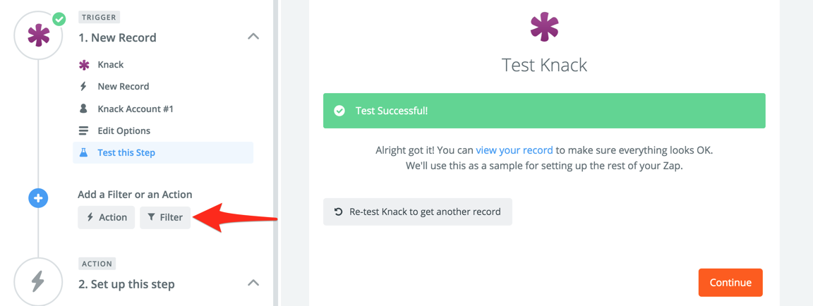 Before moving on to create your Action , you can add multiple filters to the trigger to only allow specific records to trigger the action. You can do this by clicking on the plus sign in the left-hand menu and selecting the Filter option.