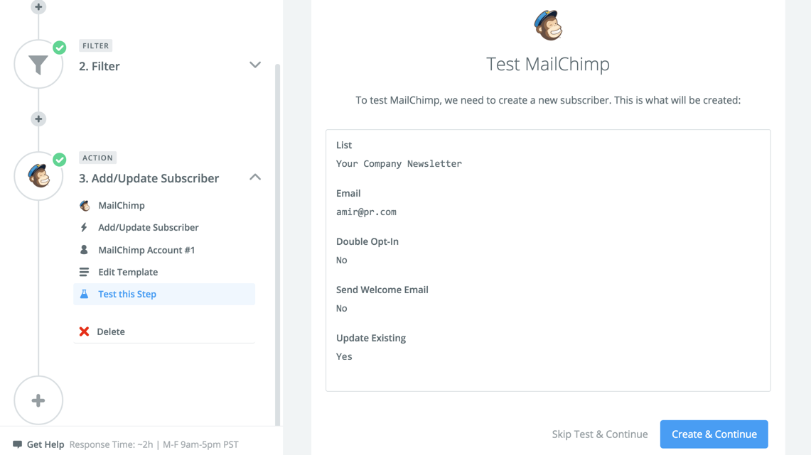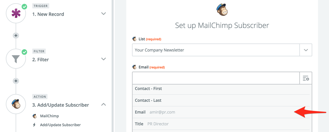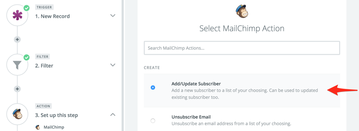 What happens if the Contact you're adding already exists in your Mailchimp list?! Thankfully, Zapier has an option to Update Existing subscribers. This comes in handy when you want to simply update the other optional values to send an up-to-date email.