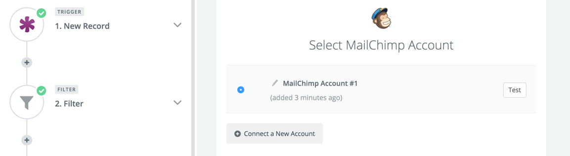 Select your Mailchimp account. If you haven't already added your Mailchimp account, you'll be given the option to do so by logging in with your Mailchimp credentials. Select the Test button to confirm that the account is working properly.