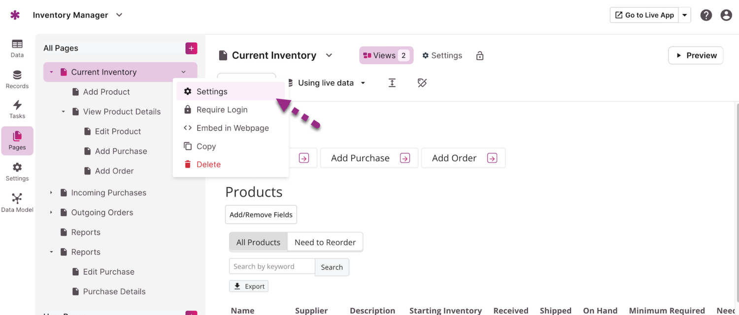 Every page will open with a unique knack.com URL. You can share these URLs with your users so that they can easily access your application.