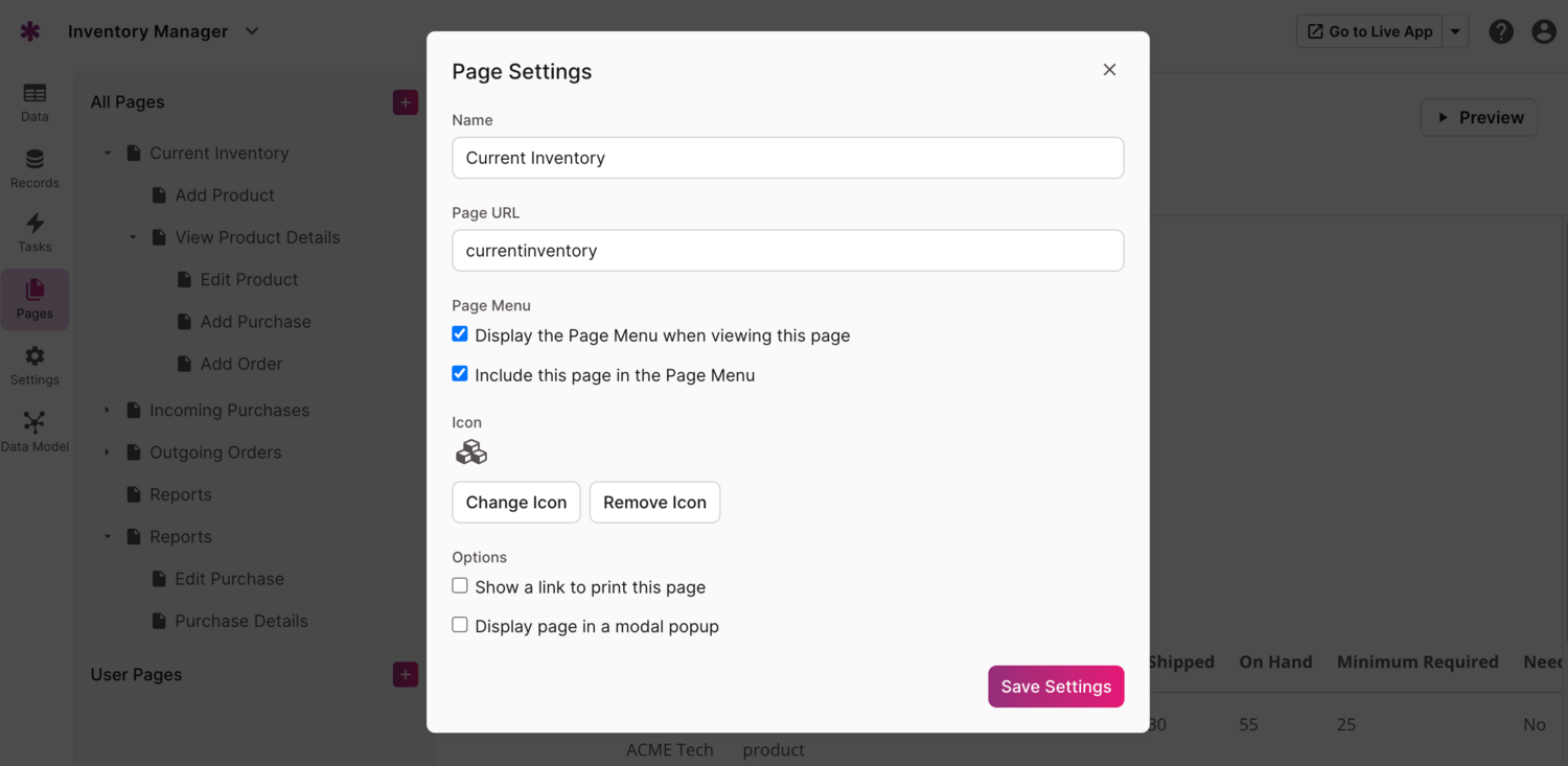 You also have the option to customize the icon for each page, show a link to print the page, display the page in a modal popup, and modify the page name that appears in the URL.