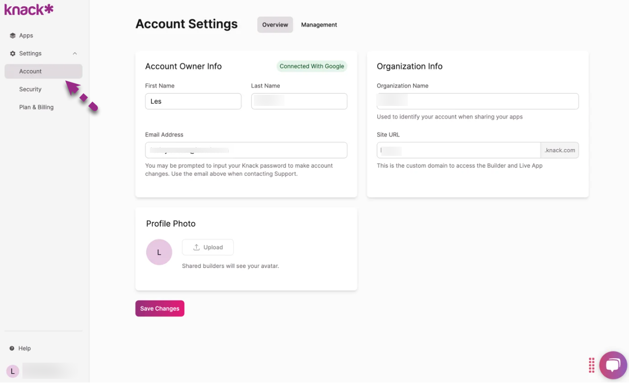 Account changes can be made from within the Knack Dashboard by the account owner: