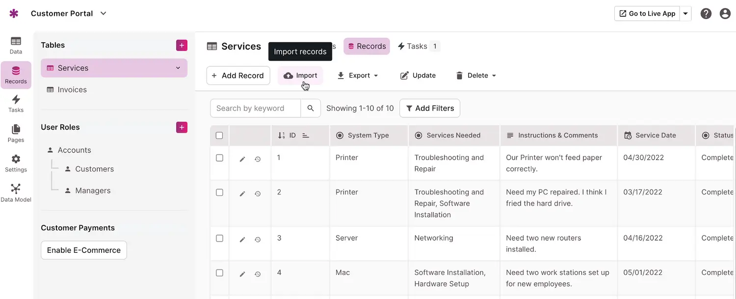 Individual records can be added directly from the live application with a form view. This is typically the most common method for adding records to an app.