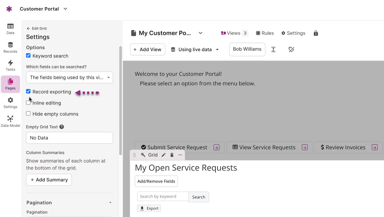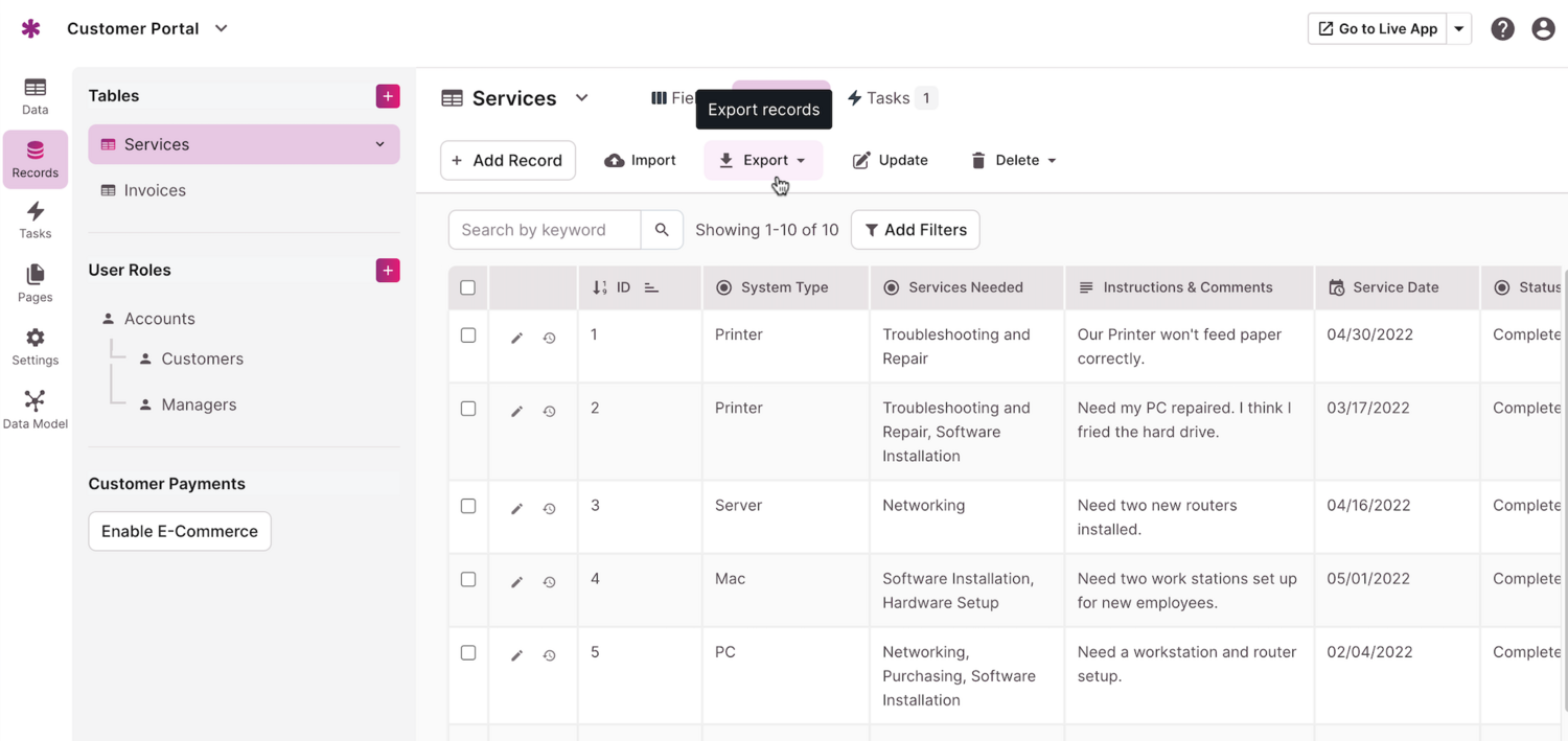You can export records directly from the Live App by enabling exports on any views displaying multiple records (grids, lists, etc.) Exporting can be enabled from the "Settings" section of the view editor in the Builder.