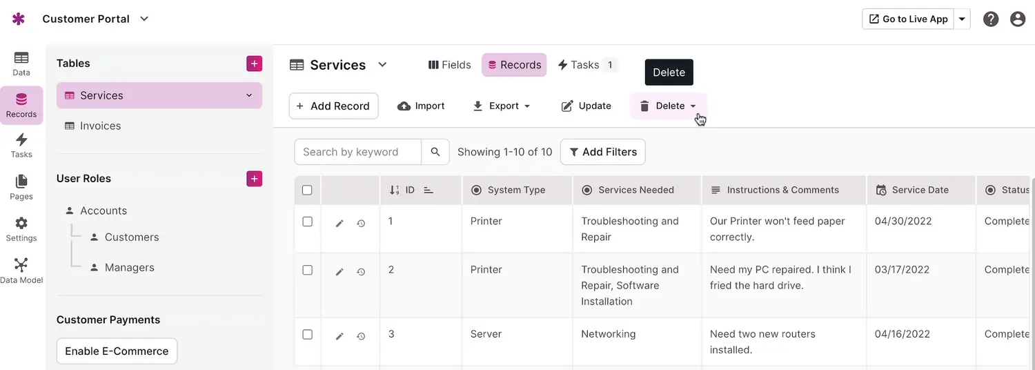 Note: Deleting a record does not delete any connected records from other tables. For example, if you delete a company record, any contact records that were connected to that company will still exist in your app's database.