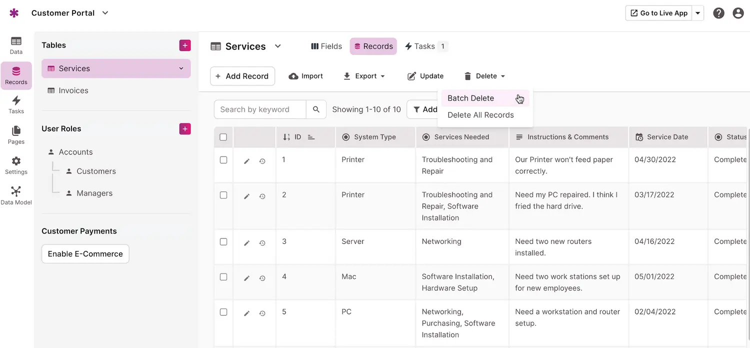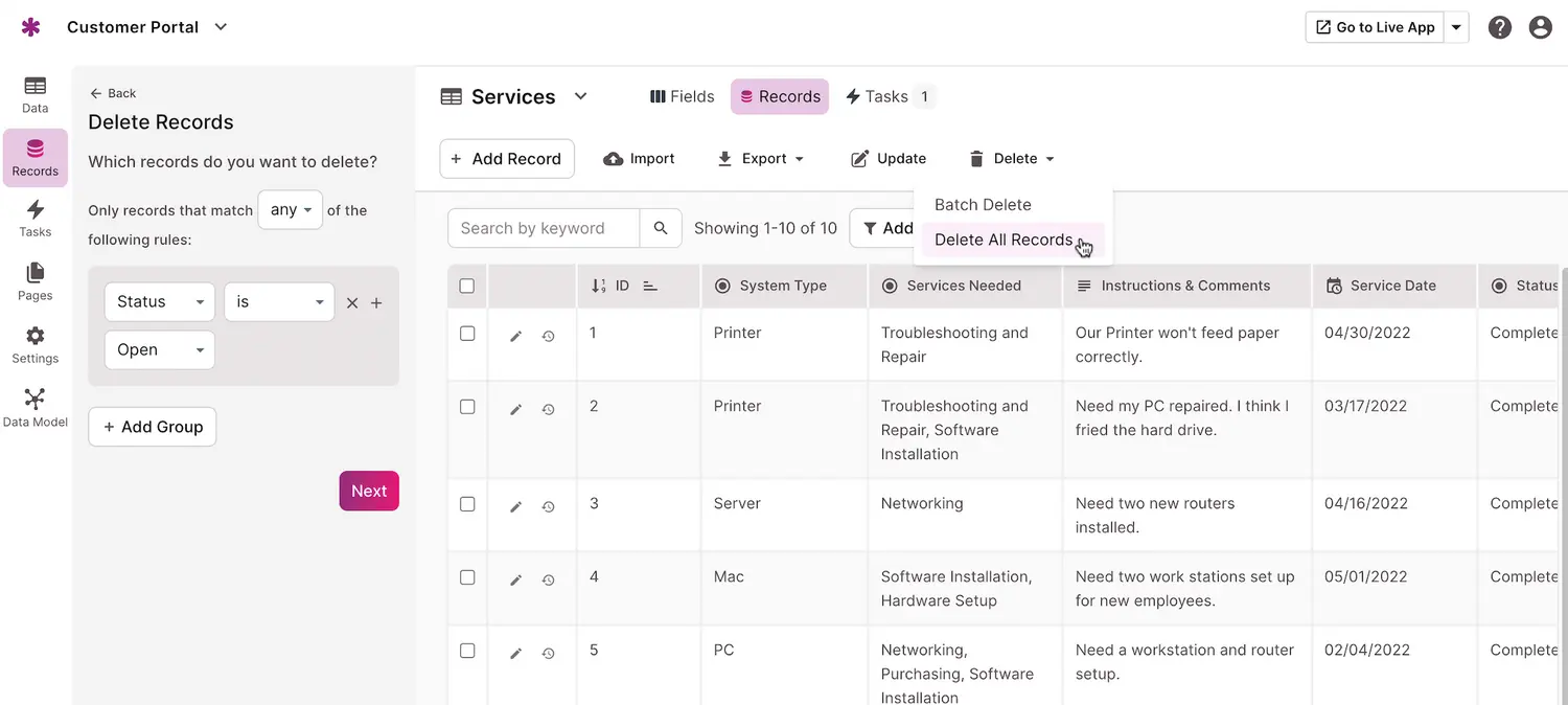 To delete a large number of records at once, you can use the batch delete feature. This is similar to a batch update and allows you to add filters to select which records to delete.
