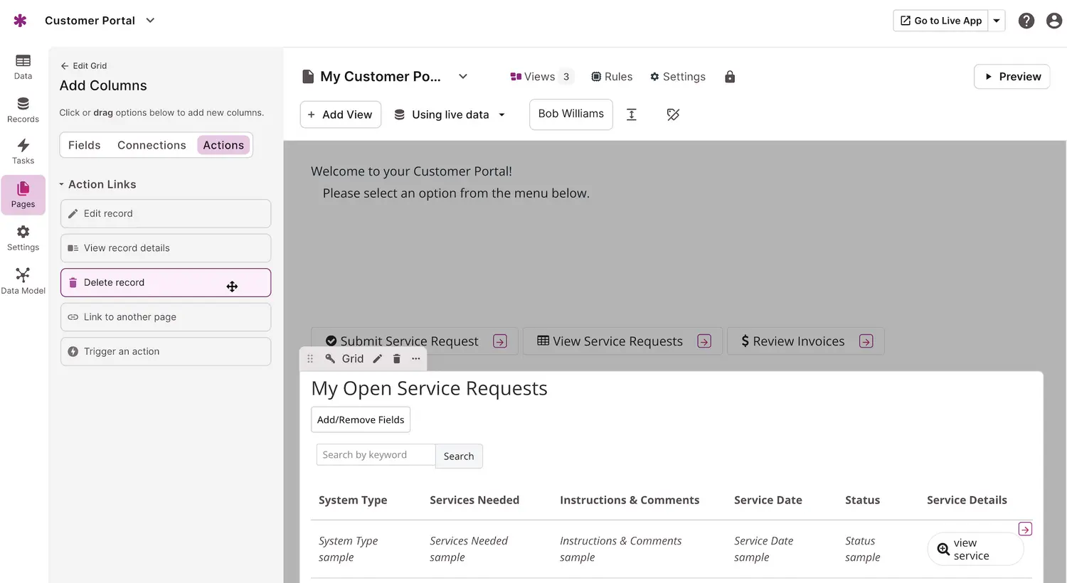 Users have the option to add delete links to views in the Live App, which enables them to easily delete records. These delete links can be added from the Actions tab when fields are being added in the view editor.